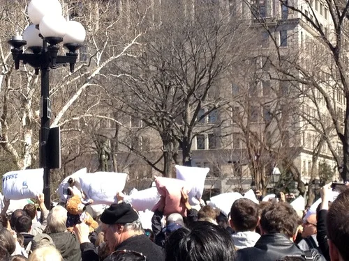 Do you remember sleepover nights when you were young where you and your friends broke into a pillow fight? Add in an extra hundred people or two and you get the pillow fight that took place in Washington Square Park this weekend!
